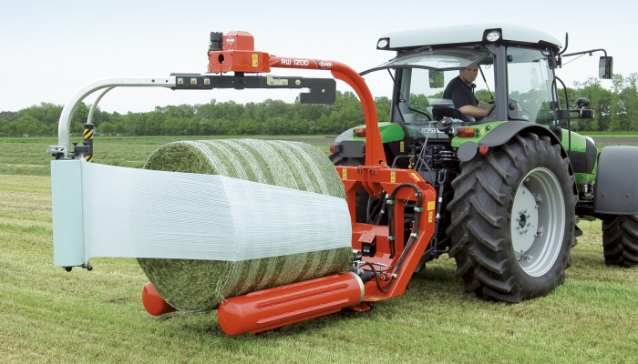RW 1200 selvlæssende rundballe indpakker kan læsse, transportere og indpakke ballen under kørsel. Det 3-punktsophængte design sørger for at tyngdepunktet kommer tæt på traktoren, så stabilitet og vægtfordeling er optimal under indpakning/transport.